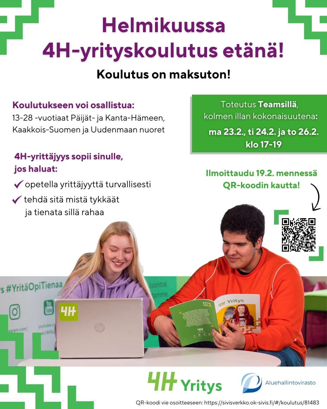 Verkkokoulutusvaihtoehto sopii 15 vuotta täyttäneille nuorille, jotka haluavat perustaa 4H-yrityksen ja lähikoulutusta ei ole tarjolla lähiaikoina. Verkkokoulutuksesta löytyy lisätietoa täältä.