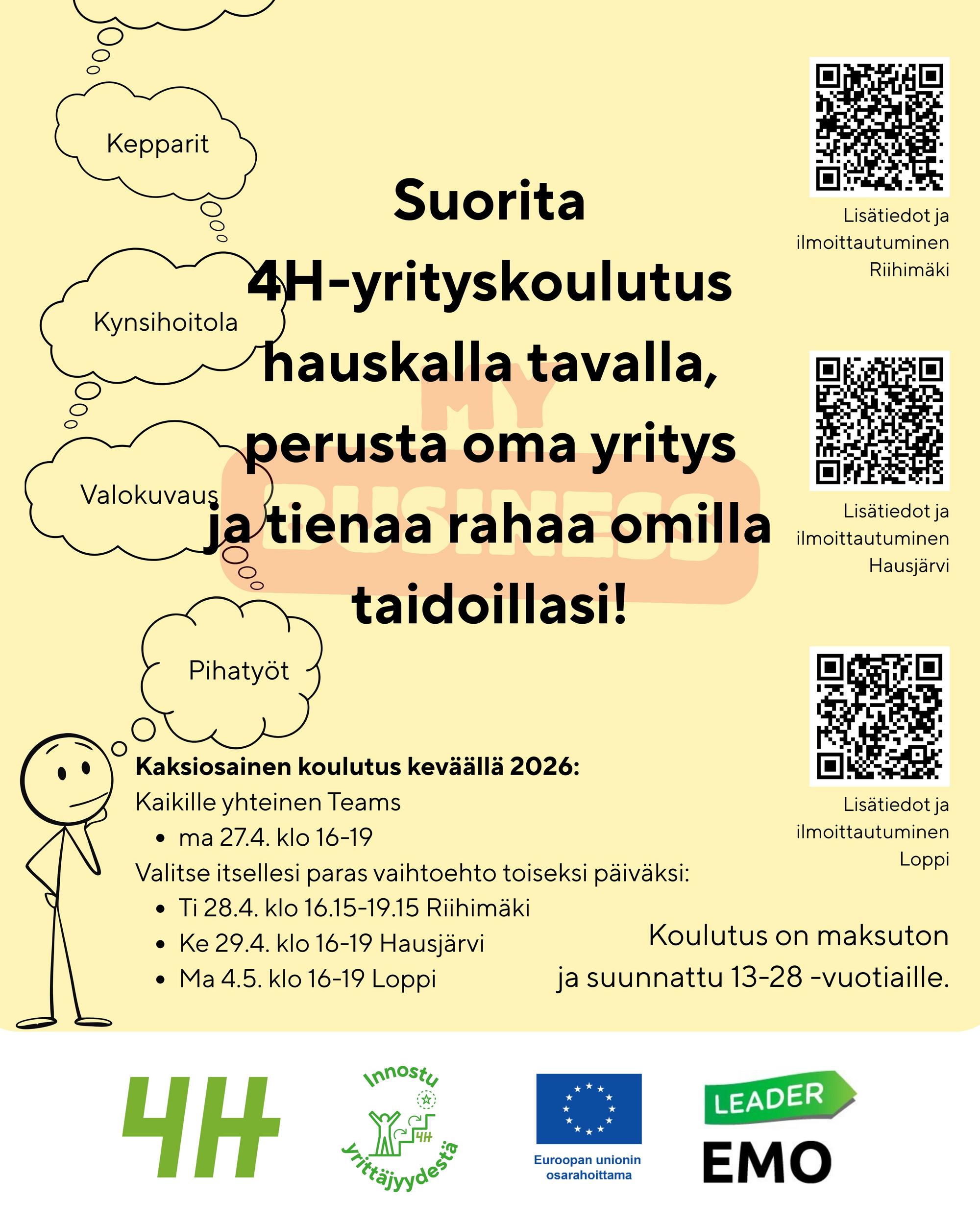4H-yrityskoulutus on tarkoitettu 13-28-vuotiaille. Koulutuksessa mietitään ideoita, joilla voi tienata omaa rahaa. Niistä kehitetään yritysidea ja koulutuksen jälkeen on mahdollista perustaa oma 4H-yritys.