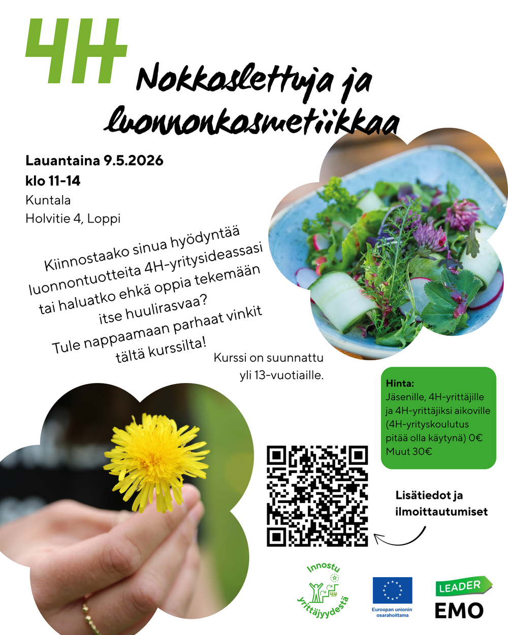 4H-yrityskoulutus järjestetään kaksiosaisena 27.4. & 4.5.2026 Ma 27.4. klo 16-19 Teams Ma 4.5. klo 16-19, Kuntala, Holvitie 4 Koulutus on maksuton.