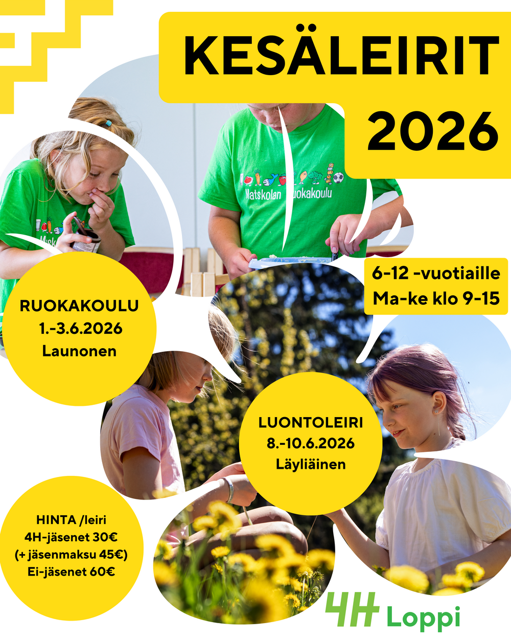 Kesäkuun ensimmäisellä viikolla 1.-5.6. järjestettävä leiri on suunnattu yli 13 -vuotiaille yrittäjyydestä kiinnostuneille nuorille. Leirillä käydään 4H-yrityskoulutus ja tuotetaan ennalta…