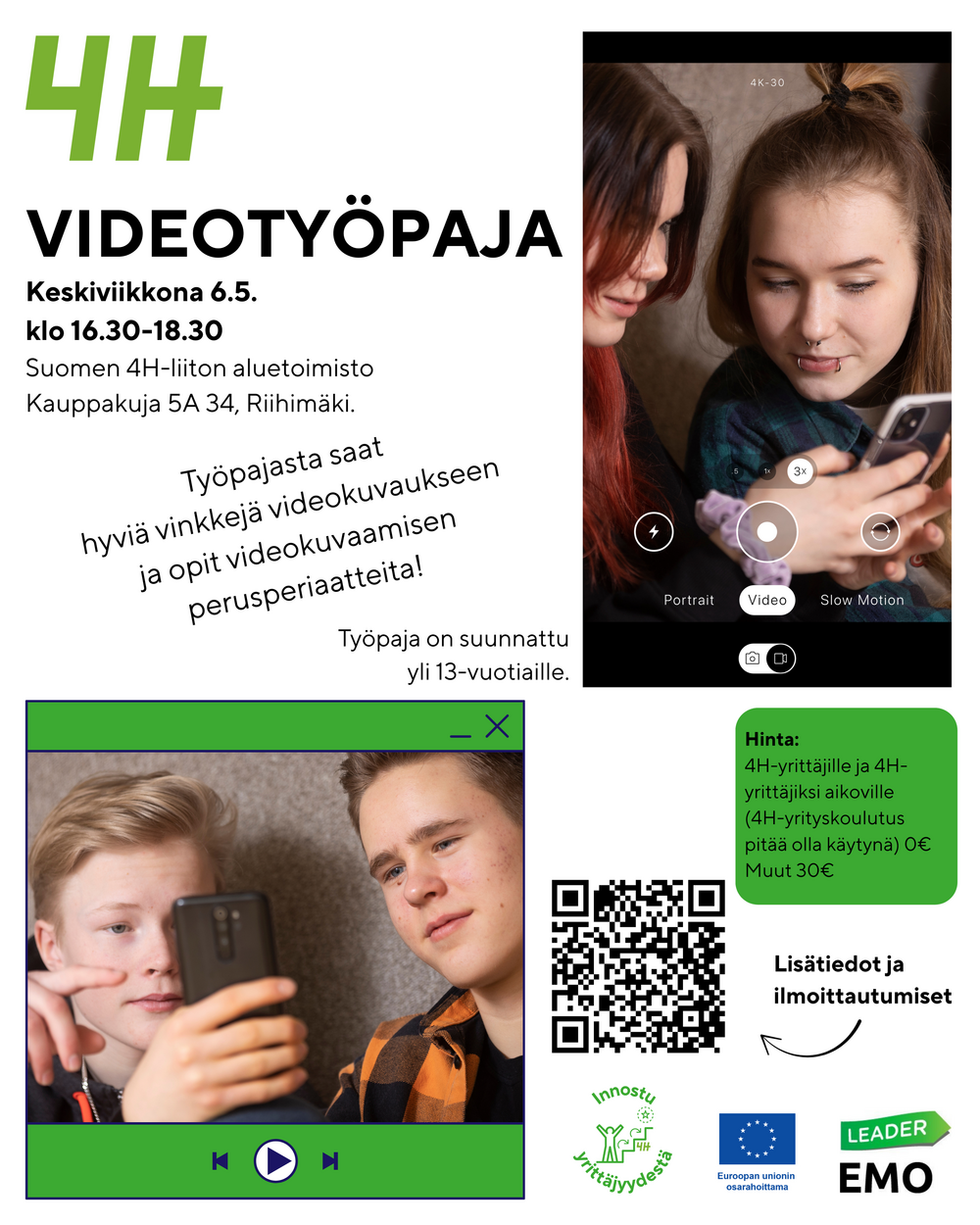 Työpajasta saat vinkit ja opit videokuvaukseen! Työpaja sopii erityisesti 4H-yrityskilpailun osallistujille, mutta on avoin kaikille 13-28-vuotiaille.