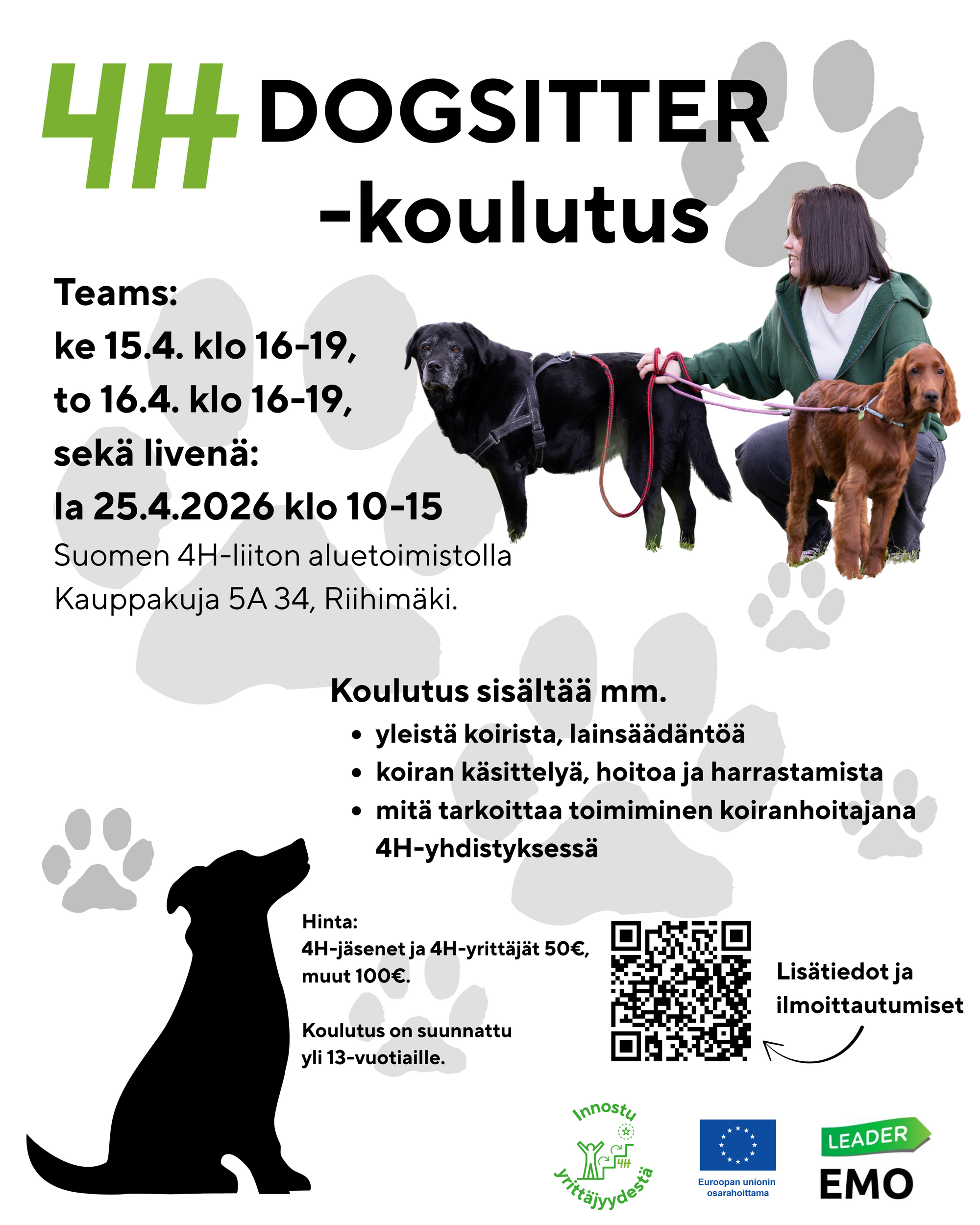 Huhtikuussa tarjoamme nuorille tilaisuuden oppia lisää koiranhoidosta 4H-Dogsitterkoulutuksessa. Koulutuksen käymällä voit työllistyä yhdistykseen dogsitteriksi tai hyödyntää taitoja 4H-yrittäjänä!