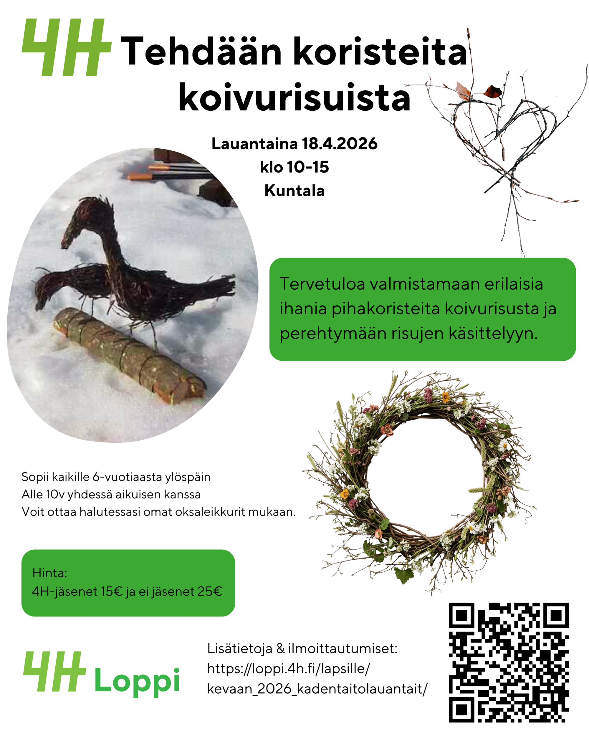 Kädentaitolauantaina 18.4. keskitytään risutöiden tekoon. Koivurisut ovat mielenkiintoinen materiaali, josta voi taiteilla esimerkiksi kransseja ja pihakoristeita.