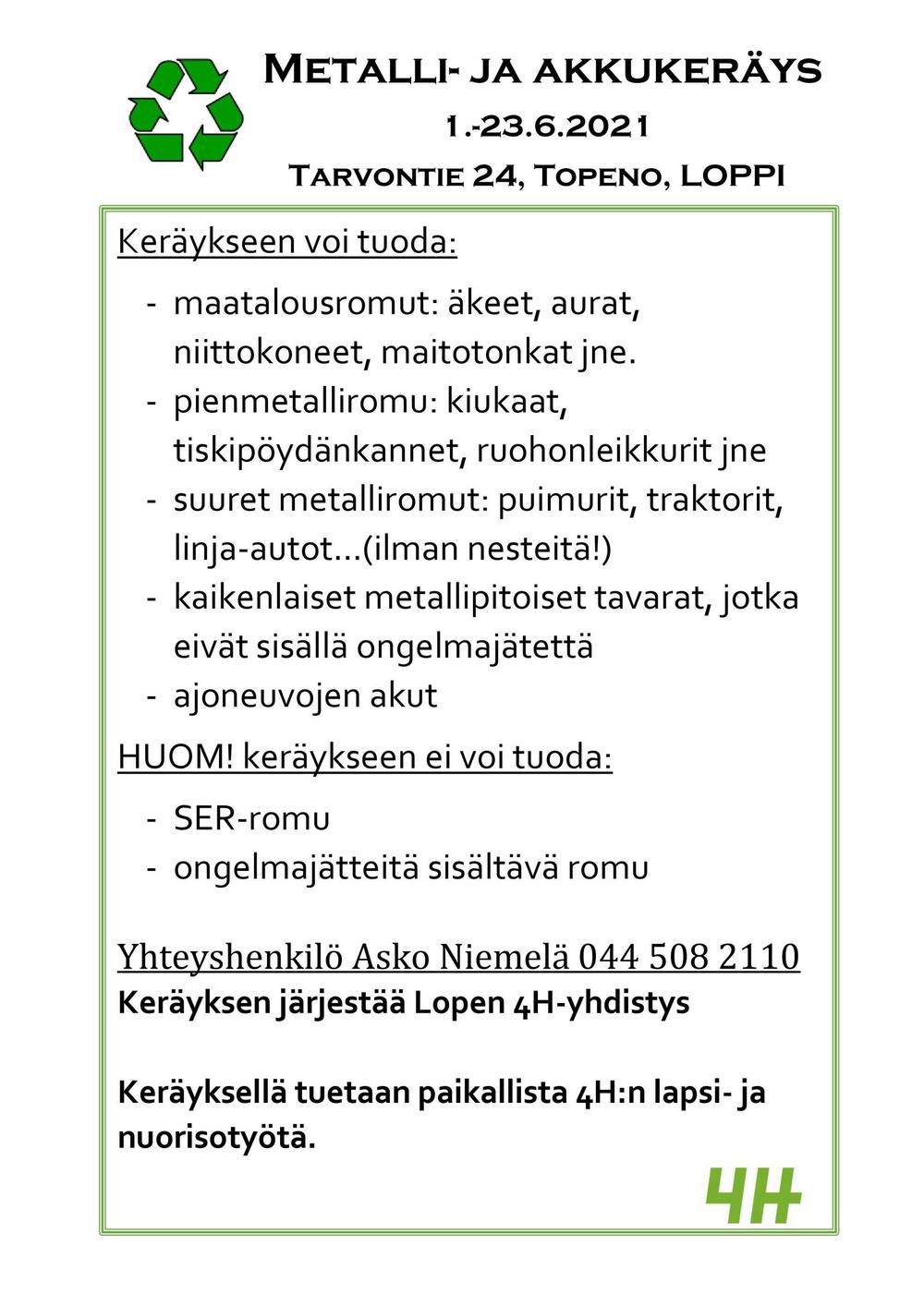Metalli- ja akkukeräys ajankohta on 1.-23.6.2021
